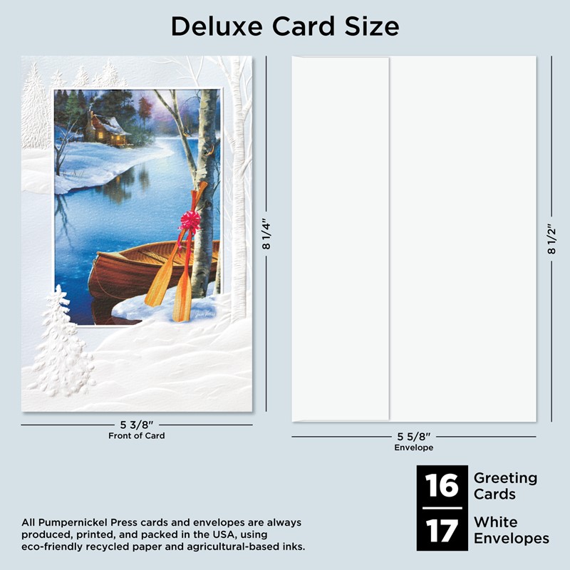 Our Deluxe Cards measure a generous 8-1/4"x 5-3/8", but require no additional postage to send. Cards are printed on uncoated, textured cardstock, using our signature production process for rich, brilliant colors. Our detailed, sculptured embossing gives our products a luxurious feel and quality, for a card to delight both giver and recipient. All Pumpernickel Press cards and envelopes are always produced, printed, and packed in the USA, using eco-friendly recycled paper and agricultural-based inks.
