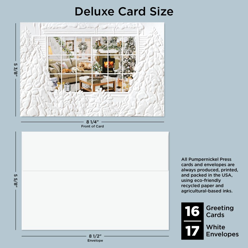 Our Deluxe Cards measure a generous 8-1/4"x 5-3/8", but require no additional postage to send. Cards are printed on uncoated, textured cardstock, using our signature production process for rich, brilliant colors. Our detailed, sculptured embossing gives our products a luxurious feel and quality, for a card to delight both giver and recipient. All Pumpernickel Press cards and envelopes are always produced, printed, and packed in the USA, using eco-friendly recycled paper and agricultural-based inks.