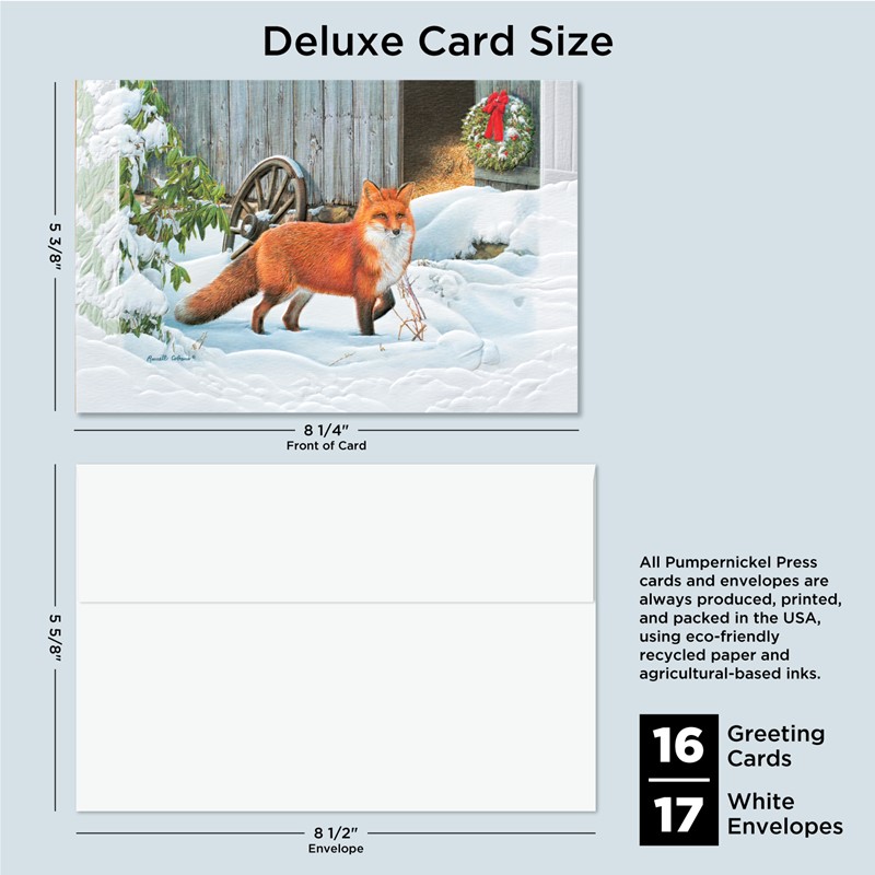 Our Deluxe Cards measure a generous 8-1/4"x 5-3/8", but require no additional postage to send. Cards are printed on uncoated, textured cardstock, using our signature production process for rich, brilliant colors. Our detailed, sculptured embossing gives our products a luxurious feel and quality, for a card to delight both giver and recipient. All Pumpernickel Press cards and envelopes are always produced, printed, and packed in the USA, using eco-friendly recycled paper and agricultural-based inks.
