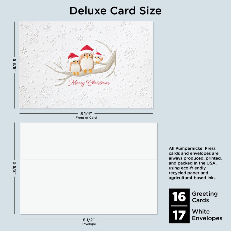 Our Deluxe Cards measure a generous 8-1/4"x 5-3/8", but require no additional postage to send. Cards are printed on uncoated, textured cardstock, using our signature production process for rich, brilliant colors. Our detailed, sculptured embossing gives our products a luxurious feel and quality, for a card to delight both giver and recipient. All Pumpernickel Press cards and envelopes are always produced, printed, and packed in the USA, using eco-friendly recycled paper and agricultural-based inks.