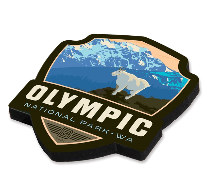 This emblem design depicts one of the mountain goats that inhabits Olympic National Park climbing down the side of a steep mountain peak, on a thick recycled wood magnet.