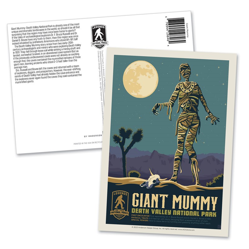 This postcard set contains 42 spooky postcards of National Park mysteries, monsters, and myths featuring the award-winning art of Anderson Design Group. The set is comprised of postcards for: