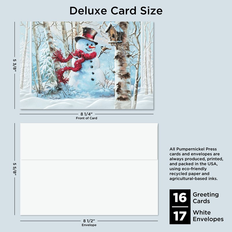 Our Deluxe Cards measure a generous 8-1/4"x 5-3/8", but require no additional postage to send. Cards are printed on uncoated, textured cardstock, using our signature production process for rich, brilliant colors. Our detailed, sculptured embossing gives our products a luxurious feel and quality, for a card to delight both giver and recipient. All Pumpernickel Press cards and envelopes are always produced, printed, and packed in the USA, using eco-friendly recycled paper and agricultural-based inks.