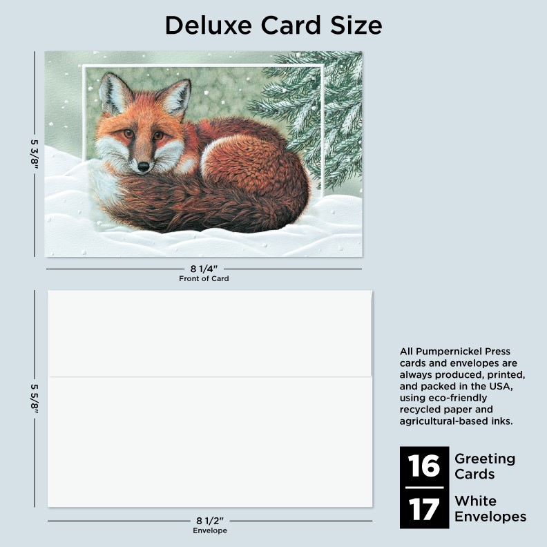 Our Deluxe Cards measure a generous 8-1/4"x 5-3/8", but require no additional postage to send. Cards are printed on uncoated, textured cardstock, using our signature production process for rich, brilliant colors. Our detailed, sculptured embossing gives our products a luxurious feel and quality, for a card to delight both giver and recipient. All Pumpernickel Press cards and envelopes are always produced, printed, and packed in the USA, using eco-friendly recycled paper and agricultural-based inks.