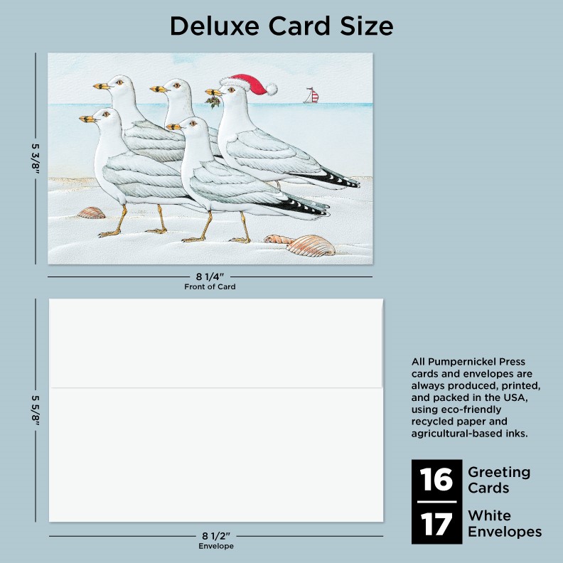 Our Deluxe Cards measure a generous 8-1/4"x 5-3/8", but require no additional postage to send. Cards are printed on uncoated, textured cardstock, using our signature production process for rich, brilliant colors. Our detailed, sculptured embossing gives our products a luxurious feel and quality, for a card to delight both giver and recipient. All Pumpernickel Press cards and envelopes are always produced, printed, and packed in the USA, using eco-friendly recycled paper and agricultural-based inks.
