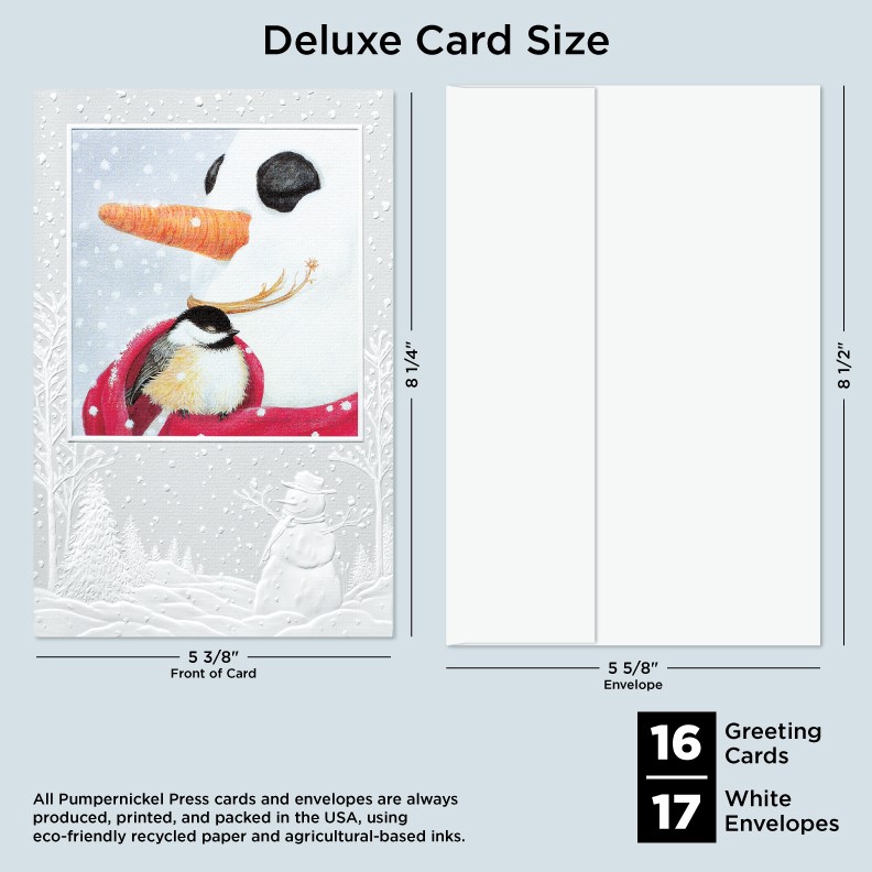 Our Deluxe Cards measure a generous 8-1/4"x 5-3/8", but require no additional postage to send. Cards are printed on uncoated, textured cardstock, using our signature production process for rich, brilliant colors. Our detailed, sculptured embossing gives our products a luxurious feel and quality, for a card to delight both giver and recipient. All Pumpernickel Press cards and envelopes are always produced, printed, and packed in the USA, using eco-friendly recycled paper and agricultural-based inks.
