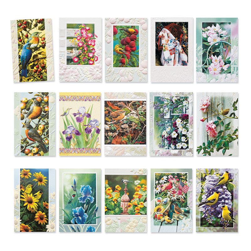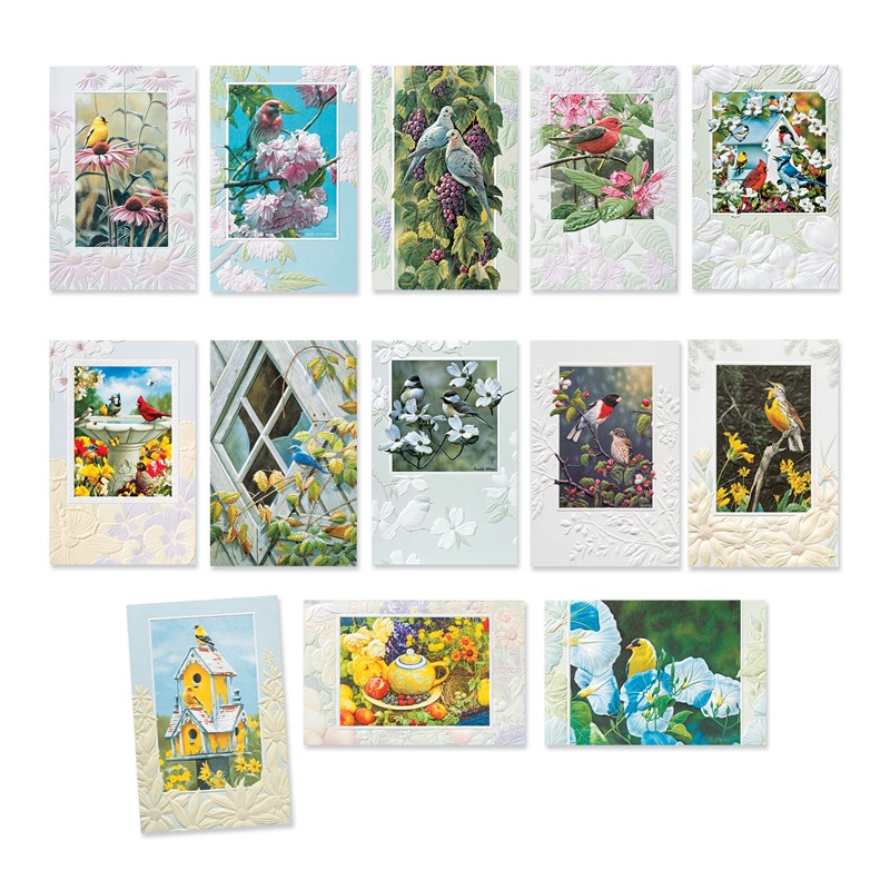 A birdwatcher's paradise! Walk through peaceful gardens and see all the delights of nature with this collection of 40 Deluxe-sized cards. Included in this set are a variety of occasional greetings, along with 1 non-greeted blank card. All artwork featured on these cards is embellished with our high-quality multilevel embossing, depicting beautiful scenes of birds, flowers, and backyard wildlife. Each card also includes fun facts and educational information about featured animals printed on the reverse. Exact designs in assortment may vary depending on availability.