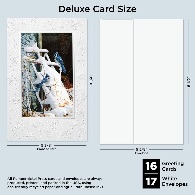 Our Deluxe Cards measure a generous 8-1/4"x 5-3/8", but require no additional postage to send. Cards are printed on uncoated, textured cardstock, using our signature production process for rich, brilliant colors. Our detailed, sculptured embossing gives our products a luxurious feel and quality, for a card to delight both giver and recipient. All Pumpernickel Press cards and envelopes are always produced, printed, and packed in the USA, using eco-friendly recycled paper and agricultural-based inks.