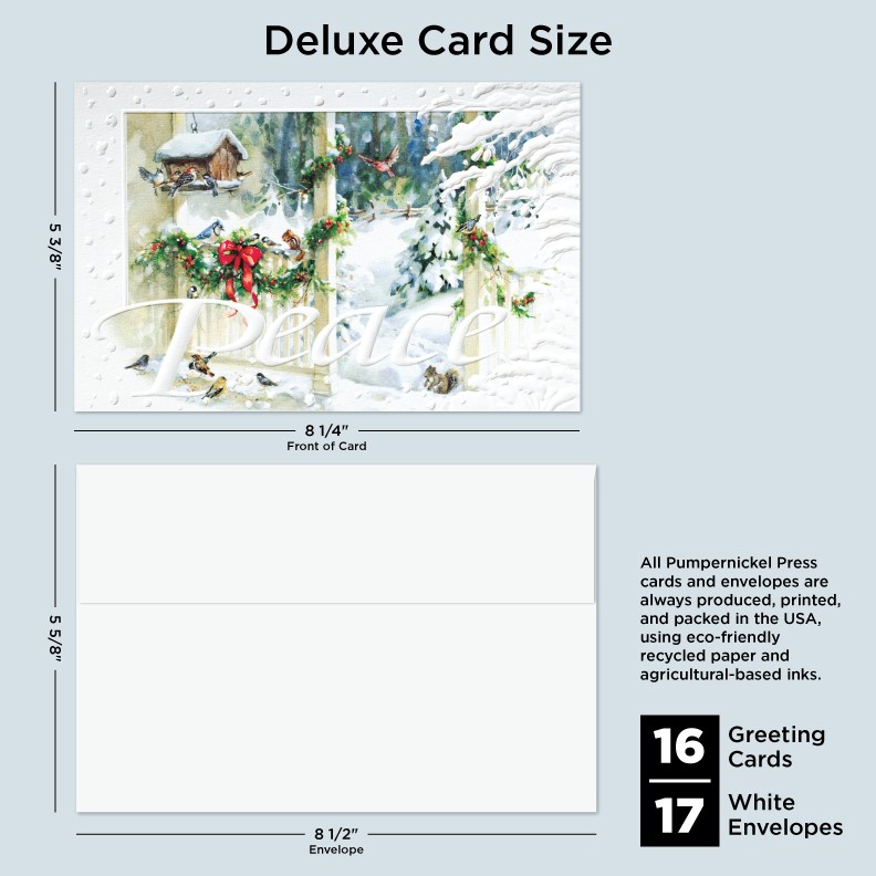 Our Deluxe Cards measure a generous 8-1/4"x 5-3/8", but require no additional postage to send. Cards are printed on uncoated, textured cardstock, using our signature production process for rich, brilliant colors. Our detailed, sculptured embossing gives our products a luxurious feel and quality, for a card to delight both giver and recipient. All Pumpernickel Press cards and envelopes are always produced, printed, and packed in the USA, using eco-friendly recycled paper and agricultural-based inks.