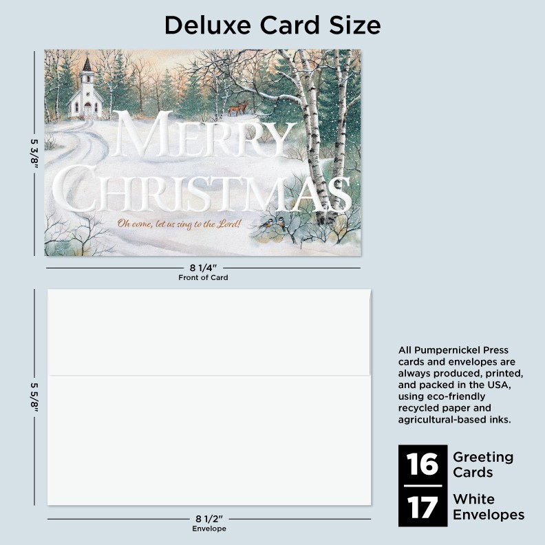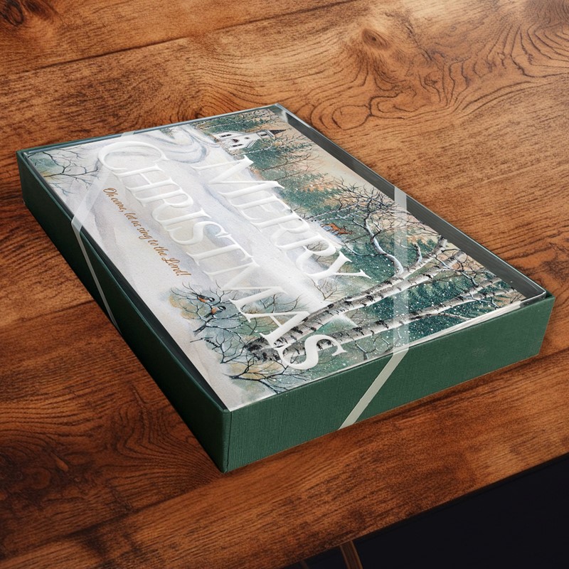 A large embossed "Merry Christmas" greeting is framed by the soft color of a watercolor painting of a country church in a woodland setting. This set of 16 holiday cards features embossed detailing and a heartfelt inside greeting with a scripture verse.
