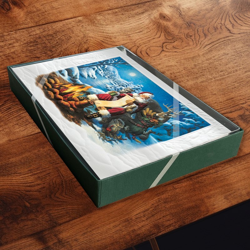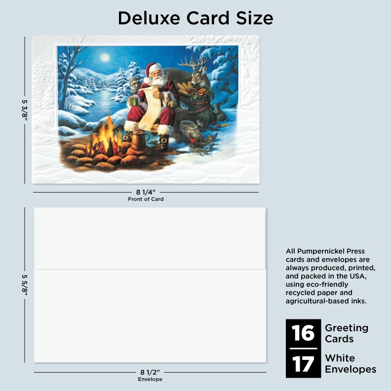 Our Deluxe Cards measure a generous 8-1/4"x 5-3/8", but require no additional postage to send. Cards are printed on uncoated, textured cardstock, using our signature production process for rich, brilliant colors. Our detailed, sculptured embossing gives our products a luxurious feel and quality, for a card to delight both giver and recipient. All Pumpernickel Press cards and envelopes are always produced, printed, and packed in the USA, using eco-friendly recycled paper and agricultural-based inks.