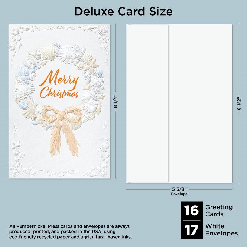 Our Deluxe Cards measure a generous 8-1/4"x 5-3/8", but require no additional postage to send. Cards are printed on uncoated, textured cardstock, using our signature production process for rich, brilliant colors. Our detailed, sculptured embossing gives our products a luxurious feel and quality, for a card to delight both giver and recipient. All Pumpernickel Press cards and envelopes are always produced, printed, and packed in the USA, using eco-friendly recycled paper and agricultural-based inks.