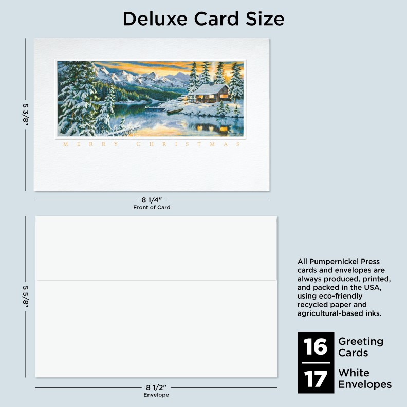Our Deluxe Cards measure a generous 8-1/4"x 5-3/8", but require no additional postage to send. Cards are printed on uncoated, textured cardstock, using our signature production process for rich, brilliant colors. Our detailed, sculptured embossing gives our products a luxurious feel and quality, for a card to delight both giver and recipient. All Pumpernickel Press cards and envelopes are always produced, printed, and packed in the USA, using eco-friendly recycled paper and agricultural-based inks.