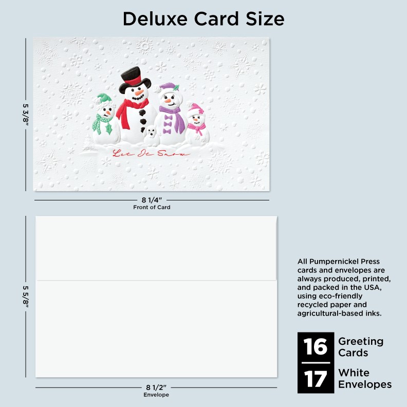 Our Deluxe Cards measure a generous 8-1/4"x 5-3/8", but require no additional postage to send. Cards are printed on uncoated, textured cardstock, using our signature production process for rich, brilliant colors. Our detailed, sculptured embossing gives our products a luxurious feel and quality, for a card to delight both giver and recipient. All Pumpernickel Press cards and envelopes are always produced, printed, and packed in the USA, using eco-friendly recycled paper and agricultural-based inks.