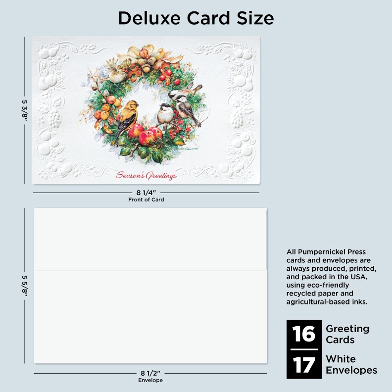 Our Deluxe Cards measure a generous 8-1/4"x 5-3/8", but require no additional postage to send. Cards are printed on uncoated, textured cardstock, using our signature production process for rich, brilliant colors. Our detailed, sculptured embossing gives our products a luxurious feel and quality, for a card to delight both giver and recipient. All Pumpernickel Press cards and envelopes are always produced, printed, and packed in the USA, using eco-friendly recycled paper and agricultural-based inks.