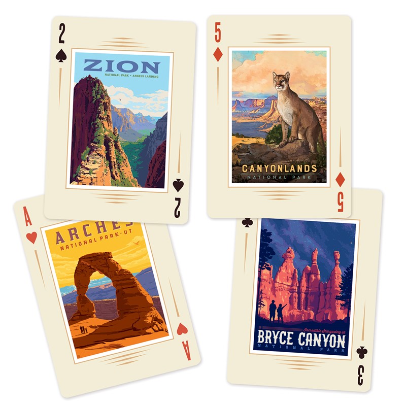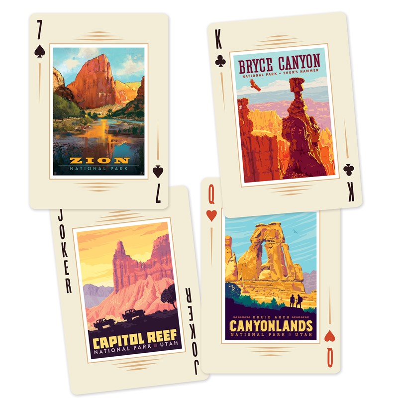 Take in the grandeur of Utah's most scenic landscapes every game night with this beautiful set of playing cards. Featuring the award-winning illustrations of Anderson Design Group, this regulation poker deck contains 15 original, vintage-style images of the state's iconic "Mighty Five" National Parks: Arches, Bryce Canyon, Canyonlands, Capitol Reef, and Zion. Deck measures 2.5" x 3.5" x .75", and is designed and printed in the USA on premium cardstock.