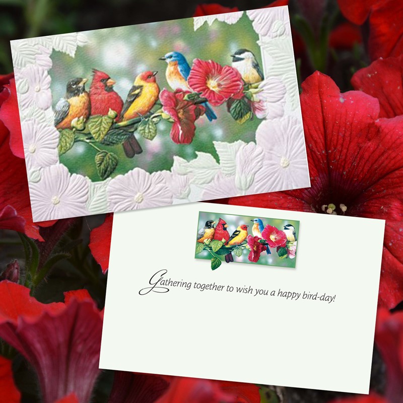 Beautifully depicted, colorful birds are a lovely way to send birthday greetings. This assortment of 30 Deluxe-sized cards includes five different birthday designs. All artwork is embellished with our high-quality multilevel embossing, featuring bright and cheerful illustrations of avian visitors. Each card also includes fun facts and educational information printed on the reverse.