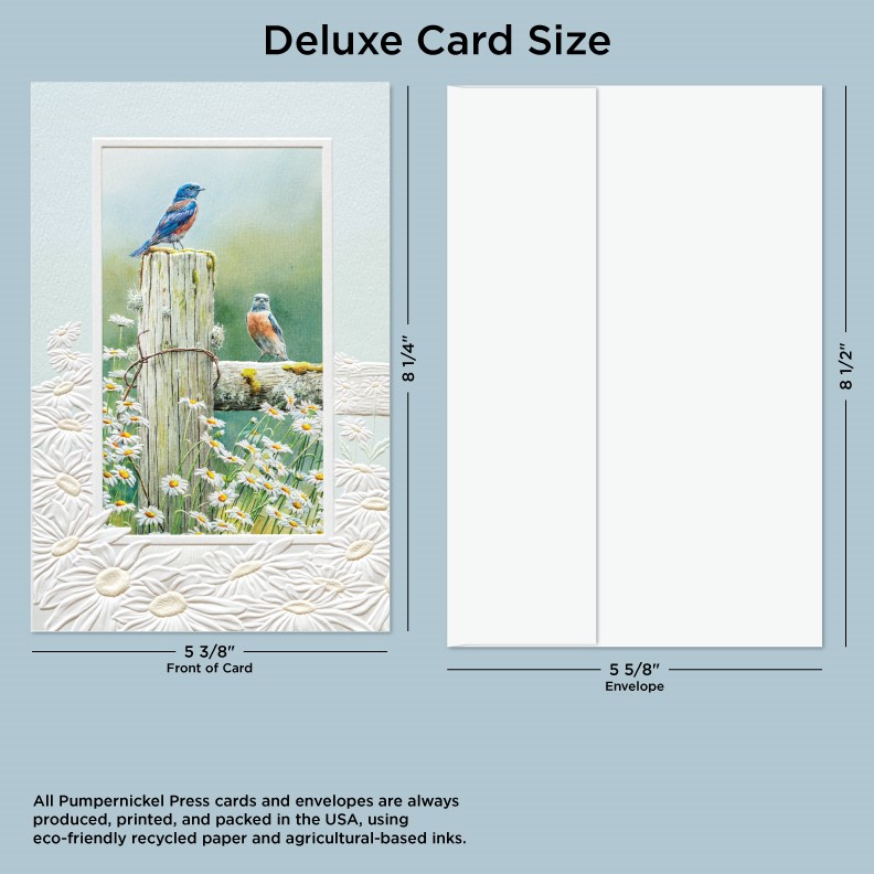 • Deluxe Cards measure a generous 8-1/4”x 5-3/8”, but require no additional postage to send. • Size-matching envelopes included. • Artwork featured on these cards is embellished with our high-quality multilevel embossing. • Each card also includes fun facts and educational information printed on the reverse. • Pumpernickel Press cards and envelopes are produced, printed, and packed in the USA, using eco-friendly recycled paper and agricultural-based inks.