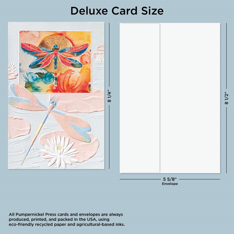• Pumpernickel Press cards and envelopes are produced, printed, and packed in the USA, using eco-friendly recycled paper and agricultural-based inks.