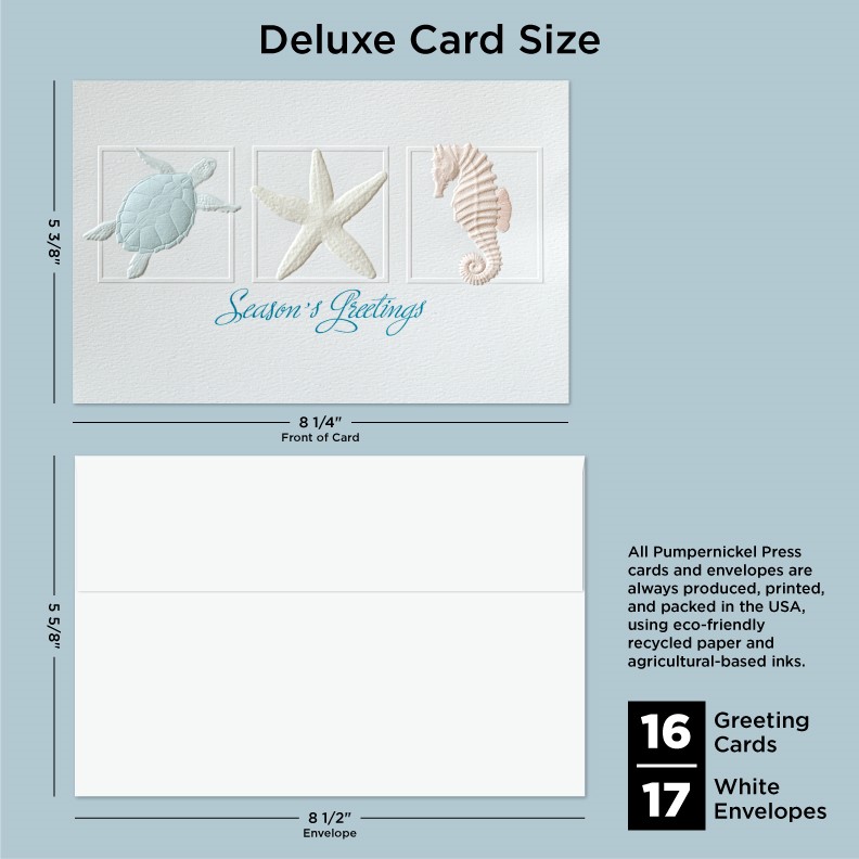 Our Deluxe Cards measure a generous 8-1/4"x 5-3/8", but require no additional postage to send. Cards are printed on uncoated, textured cardstock, using our signature production process for rich, brilliant colors. Our detailed, sculptured embossing gives our products a luxurious feel and quality, for a card to delight both giver and recipient. All Pumpernickel Press cards and envelopes are always produced, printed, and packed in the USA, using eco-friendly recycled paper and agricultural-based inks.