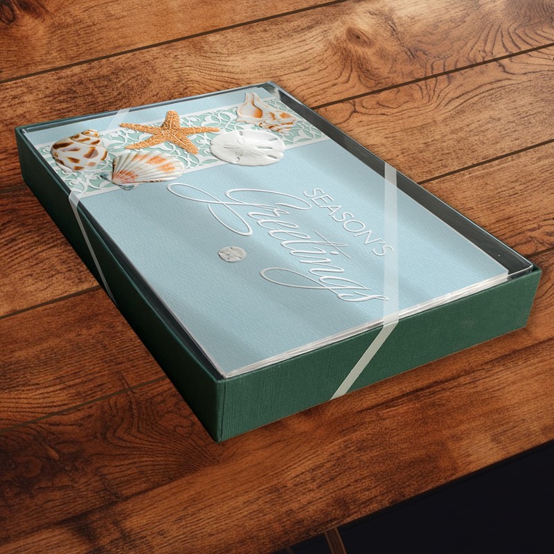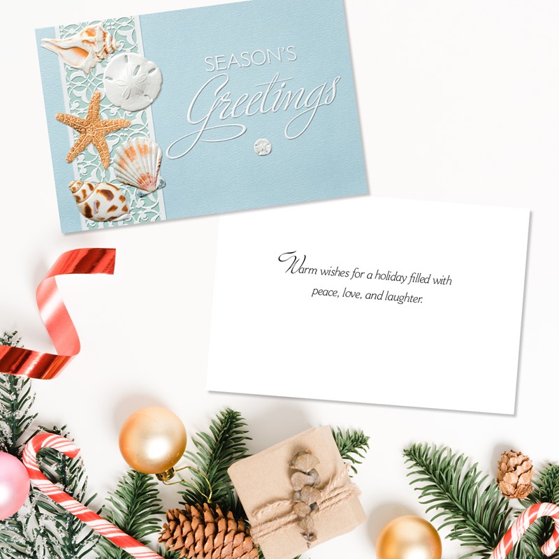 Simple, beautiful seashells – nature's own ornaments – decorate these elegant seasonal cards. This set of 16 holiday cards features embossed detailing and a heartfelt inside greeting.