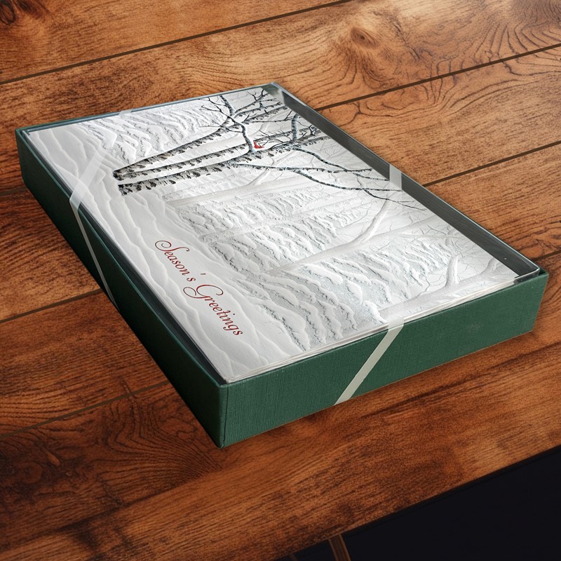 Our Deluxe Cards measure a generous 8-1/4"x 5-3/8", but require no additional postage to send. Cards are printed on uncoated, textured cardstock, using our signature production process for rich, brilliant colors. Our detailed, sculptured embossing gives our products a luxurious feel and quality, for a card to delight both giver and recipient. All Pumpernickel Press cards and envelopes are always produced, printed, and packed in the USA, using eco-friendly recycled paper and agricultural-based inks.