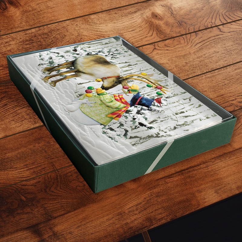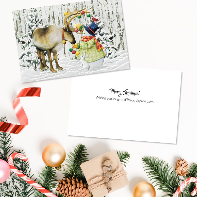 Filled with sweet whimsy and holiday cheer, a jolly snowman decorates his reindeer friend for the season in these charming Christmas cards. This set of 16 cards features embossed detailing and a heartfelt inside greeting.