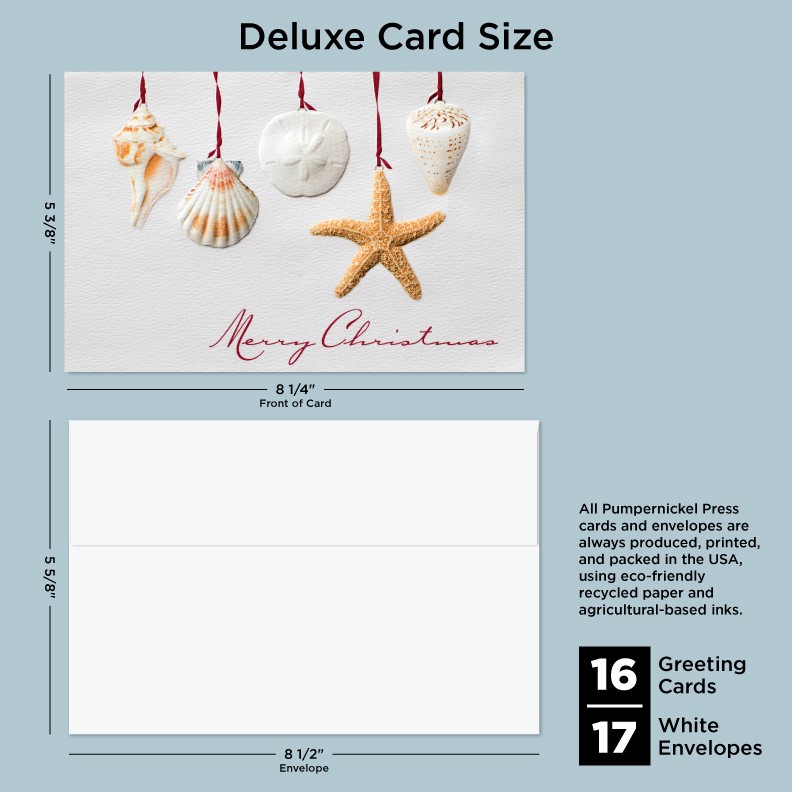 Our Deluxe Cards measure a generous 8-1/4"x 5-3/8", but require no additional postage to send. Cards are printed on uncoated, textured cardstock, using our signature production process for rich, brilliant colors. Our detailed, sculptured embossing gives our products a luxurious feel and quality, for a card to delight both giver and recipient. All Pumpernickel Press cards and envelopes are always produced, printed, and packed in the USA, using eco-friendly recycled paper and agricultural-based inks.