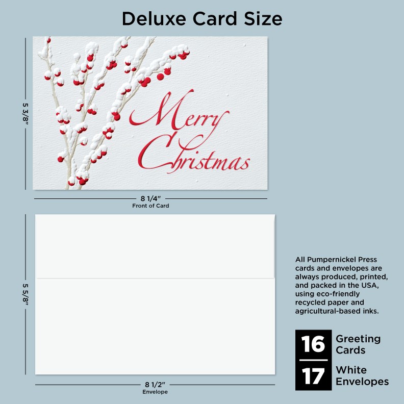 Our Deluxe Cards measure a generous 8-1/4"x 5-3/8", but require no additional postage to send. Cards are printed on uncoated, textured cardstock, using our signature production process for rich, brilliant colors. Our detailed, sculptured embossing gives our products a luxurious feel and quality, for a card to delight both giver and recipient. All Pumpernickel Press cards and envelopes are always produced, printed, and packed in the USA, using eco-friendly recycled paper and agricultural-based inks.