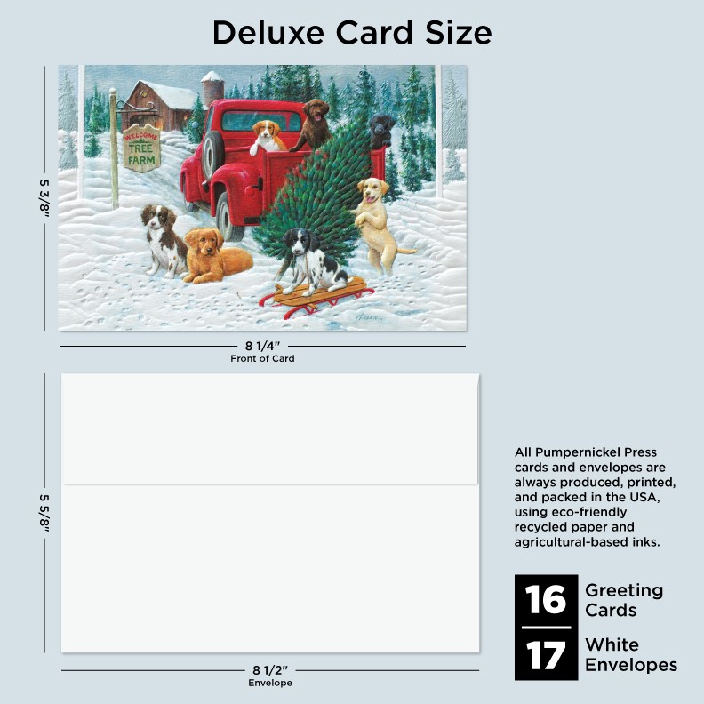 Our Deluxe Cards measure a generous 8-1/4"x 5-3/8", but require no additional postage to send. Cards are printed on uncoated, textured cardstock, using our signature production process for rich, brilliant colors. Our detailed, sculptured embossing gives our products a luxurious feel and quality, for a card to delight both giver and recipient. All Pumpernickel Press cards and envelopes are always produced, printed, and packed in the USA, using eco-friendly recycled paper and agricultural-based inks.