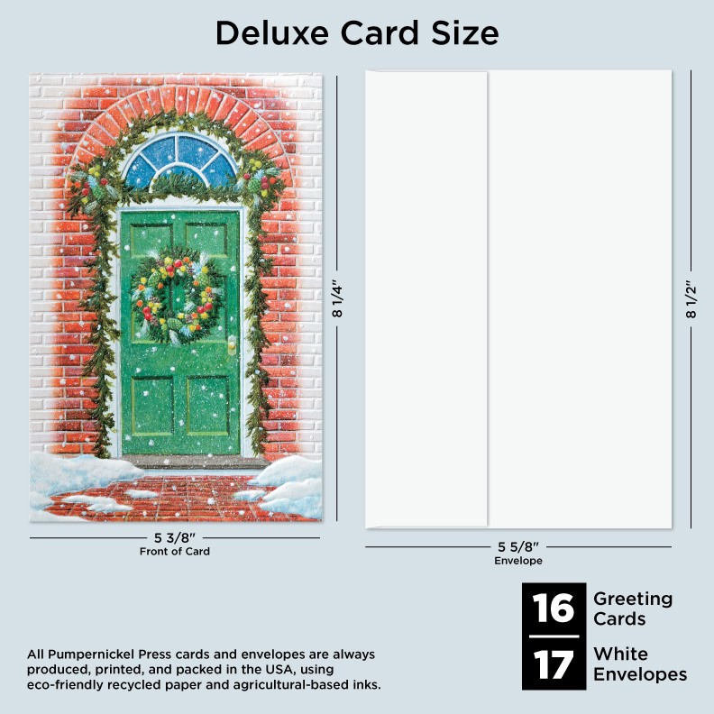 Our Deluxe Cards measure a generous 8-1/4"x 5-3/8", but require no additional postage to send. Cards are printed on uncoated, textured cardstock, using our signature production process for rich, brilliant colors. Our detailed, sculptured embossing gives our products a luxurious feel and quality, for a card to delight both giver and recipient. All Pumpernickel Press cards and envelopes are always produced, printed, and packed in the USA, using eco-friendly recycled paper and agricultural-based inks.