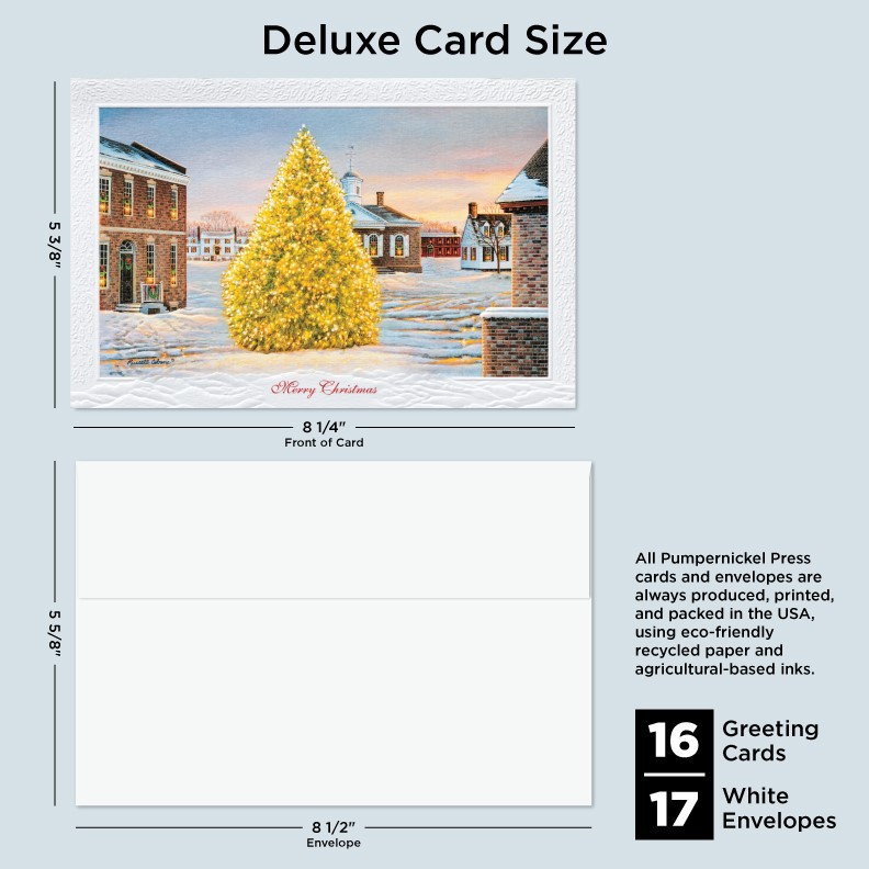 Our Deluxe Cards measure a generous 8-1/4"x 5-3/8", but require no additional postage to send. Cards are printed on uncoated, textured cardstock, using our signature production process for rich, brilliant colors. Our detailed, sculptured embossing gives our products a luxurious feel and quality, for a card to delight both giver and recipient. All Pumpernickel Press cards and envelopes are always produced, printed, and packed in the USA, using eco-friendly recycled paper and agricultural-based inks.