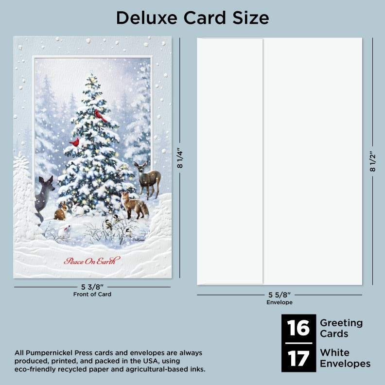 Our Deluxe Cards measure a generous 8-1/4"x 5-3/8", but require no additional postage to send. Cards are printed on uncoated, textured cardstock, using our signature production process for rich, brilliant colors. Our detailed, sculptured embossing gives our products a luxurious feel and quality, for a card to delight both giver and recipient. All Pumpernickel Press cards and envelopes are always produced, printed, and packed in the USA, using eco-friendly recycled paper and agricultural-based inks.