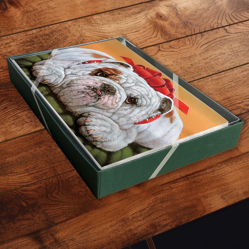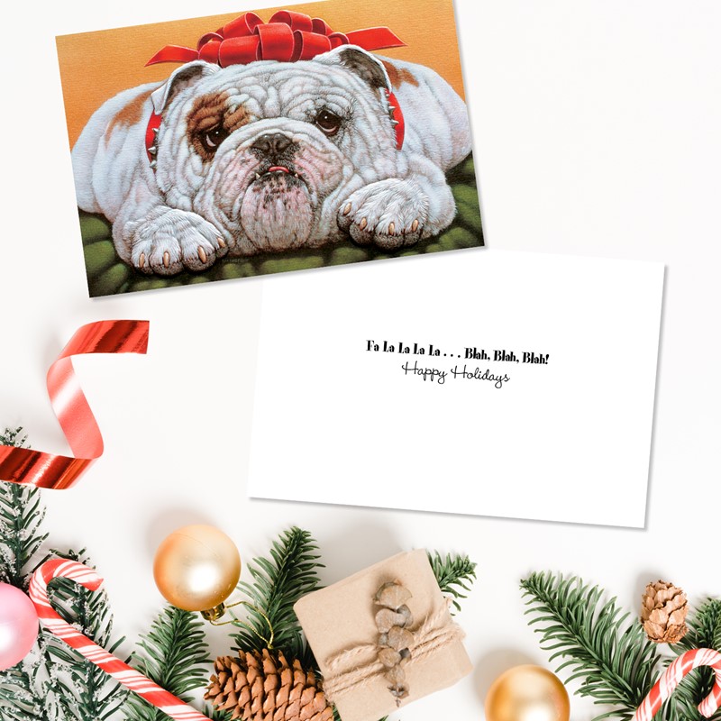 Send some holiday humor with this adorably grumpy bulldog, all decked out in his festive red bow. This set of 16 holiday cards features embossed detailing and a humorous inside greeting.