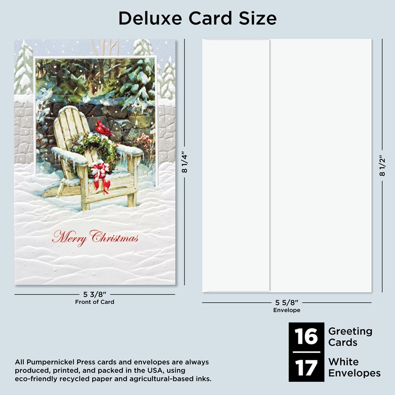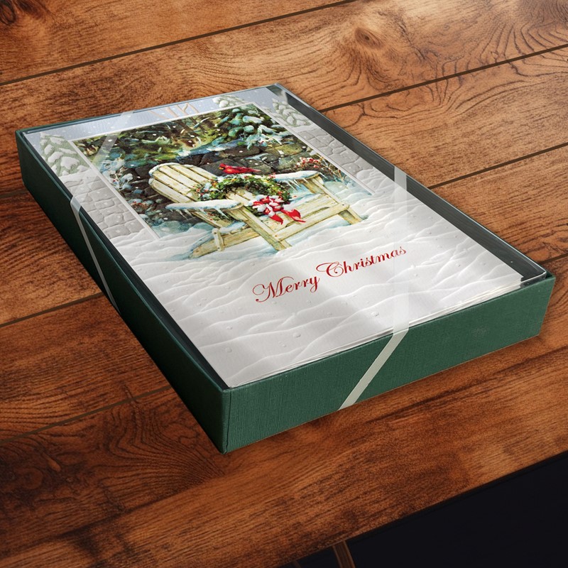 This inviting, classic, wooden Adirondack chair adorned with a Christmas wreath has enticed a cardinal to stop for a visit. This set of 16 holiday cards features embossed detailing and a heartfelt inside greeting with a scripture verse.
