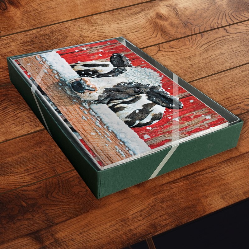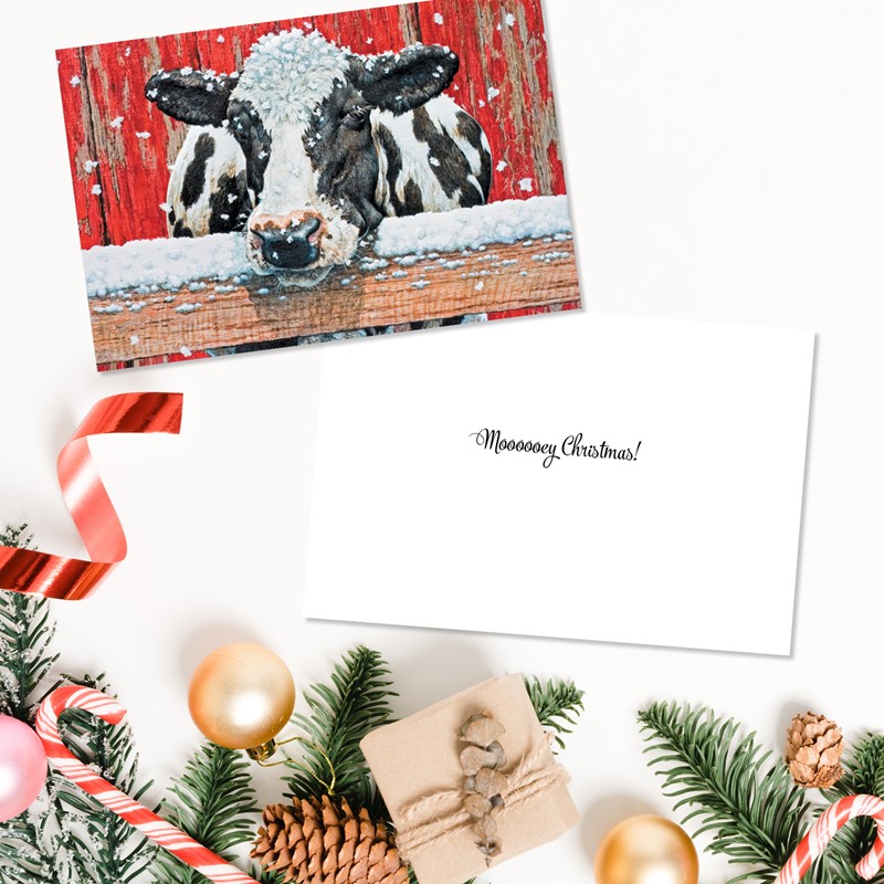 Not even a festive dusting of snowflakes can disturb the tranquility of this peaceful bovine! This set of 16 holiday cards features embossed detailing and a humorous inside greeting.