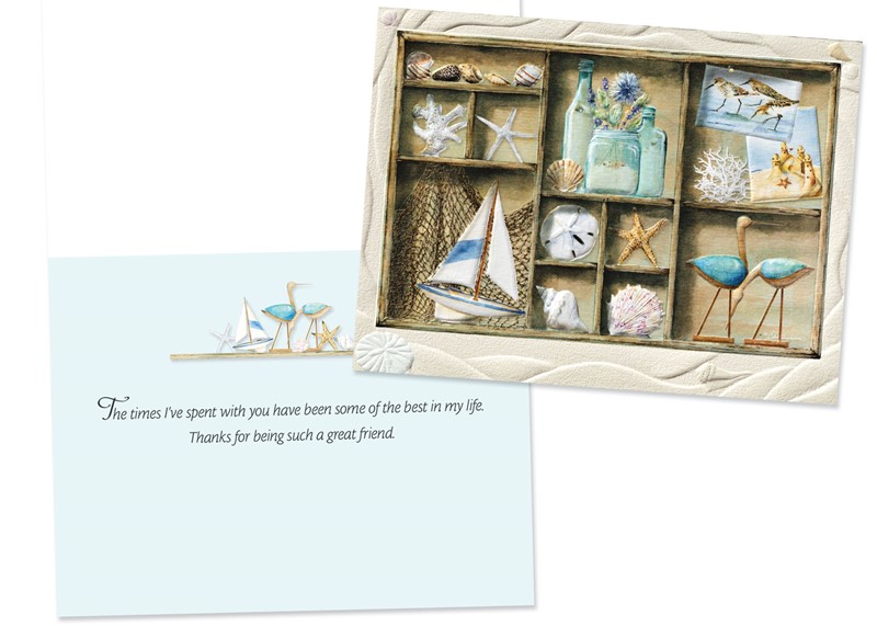 Breezy days and coastal getaways await! This beachy boxed assortment contains 32 designs of our Petite-sized cards. Included in this set are a variety of occasion greetings, along with 2 non-greeted blank cards. All artwork featured on these cards is embellished with our high-quality multilevel embossing, depicting beautiful seaside scenes and deep ocean vistas. Exact designs in assortment may vary depending on availability.