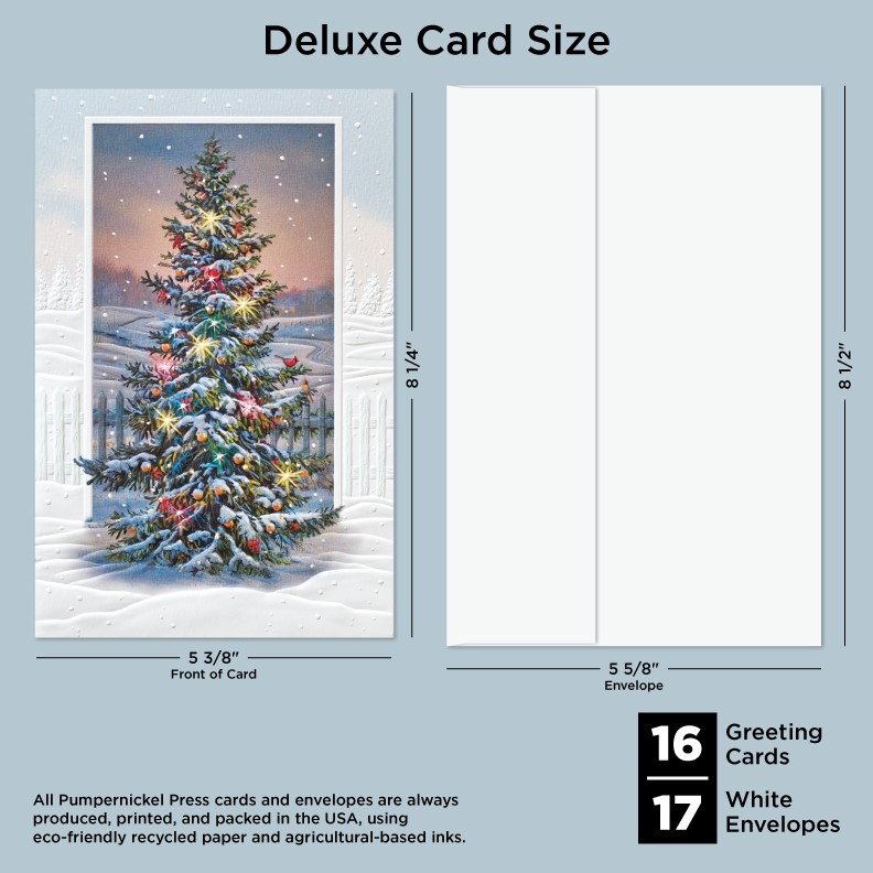 Our Deluxe Cards measure a generous 8-1/4"x 5-3/8", but require no additional postage to send. Cards are printed on uncoated, textured cardstock, using our signature production process for rich, brilliant colors. Our detailed, sculptured embossing gives our products a luxurious feel and quality, for a card to delight both giver and recipient. All Pumpernickel Press cards and envelopes are always produced, printed, and packed in the USA, using eco-friendly recycled paper and agricultural-based inks.
