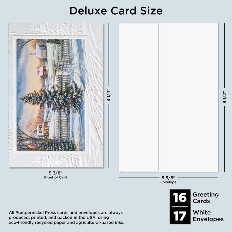 Our Deluxe Cards measure a generous 8-1/4"x 5-3/8", but require no additional postage to send. Cards are printed on uncoated, textured cardstock, using our signature production process for rich, brilliant colors. Our detailed, sculptured embossing gives our products a luxurious feel and quality, for a card to delight both giver and recipient. All Pumpernickel Press cards and envelopes are always produced, printed, and packed in the USA, using eco-friendly recycled paper and agricultural-based inks.