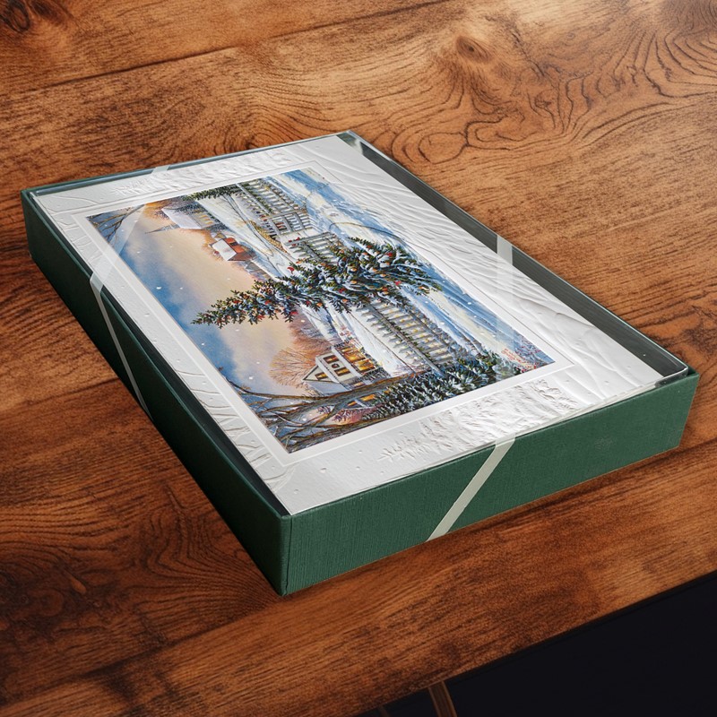 An idyllic scene of a rural farm in a snow-covered landscape with a welcoming country home decorated for Christmas. A cheerful, decorated Christmas tree welcomes visitors through the gate. This set of 16 holiday cards features embossed detailing and a heartfelt inside greeting with a scripture verse.