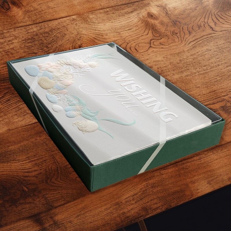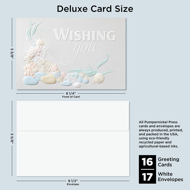 Our Deluxe Cards measure a generous 8-1/4"x 5-3/8", but require no additional postage to send. Cards are printed on uncoated, textured cardstock, using our signature production process for rich, brilliant colors. Our detailed, sculptured embossing gives our products a luxurious feel and quality, for a card to delight both giver and recipient. All Pumpernickel Press cards and envelopes are always produced, printed, and packed in the USA, using eco-friendly recycled paper and agricultural-based inks.