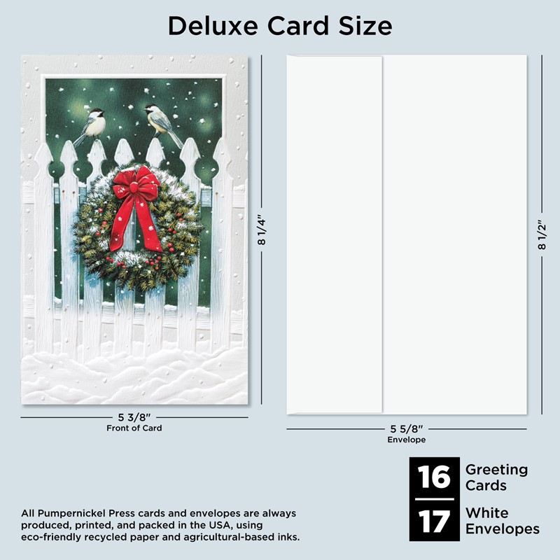 Our Deluxe Cards measure a generous 8-1/4"x 5-3/8", but require no additional postage to send. Cards are printed on uncoated, textured cardstock, using our signature production process for rich, brilliant colors. Our detailed, sculptured embossing gives our products a luxurious feel and quality, for a card to delight both giver and recipient. All Pumpernickel Press cards and envelopes are always produced, printed, and packed in the USA, using eco-friendly recycled paper and agricultural-based inks.