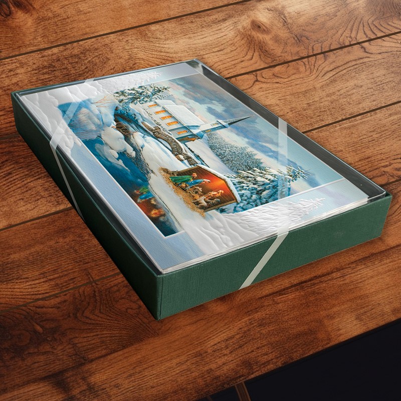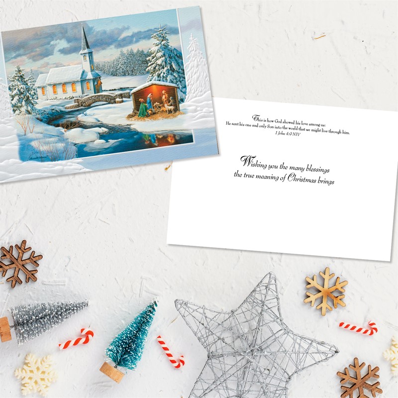 The Nativity scene is presented against the backdrop of a beautiful white country church on a crystal clear winter day. This set of 16 holiday cards features embossed detailing and a heartfelt inside greeting with a scripture verse.
