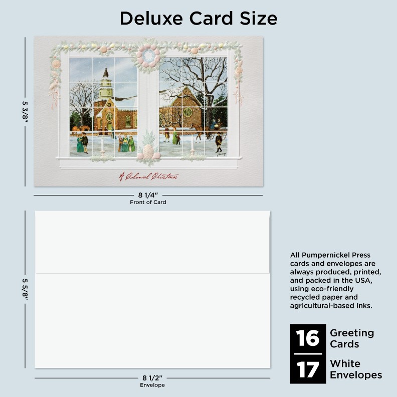 Our Deluxe Cards measure a generous 8-1/4"x 5-3/8", but require no additional postage to send. Cards are printed on uncoated, textured cardstock, using our signature production process for rich, brilliant colors. Our detailed, sculptured embossing gives our products a luxurious feel and quality, for a card to delight both giver and recipient. All Pumpernickel Press cards and envelopes are always produced, printed, and packed in the USA, using eco-friendly recycled paper and agricultural-based inks.