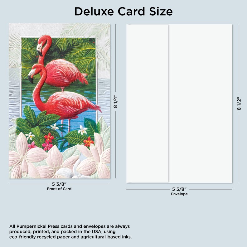 • Deluxe Cards measure a generous 8-1/4"x 5-3/8", but require no additional postage to send. • Size-matching envelopes included. • Artwork featured on these cards is embellished with our high-quality multilevel embossing. • Each card also includes fun facts and educational information printed on the reverse. • Pumpernickel Press cards and envelopes are produced, printed, and packed in the USA, using eco-friendly recycled paper and agricultural-based inks.