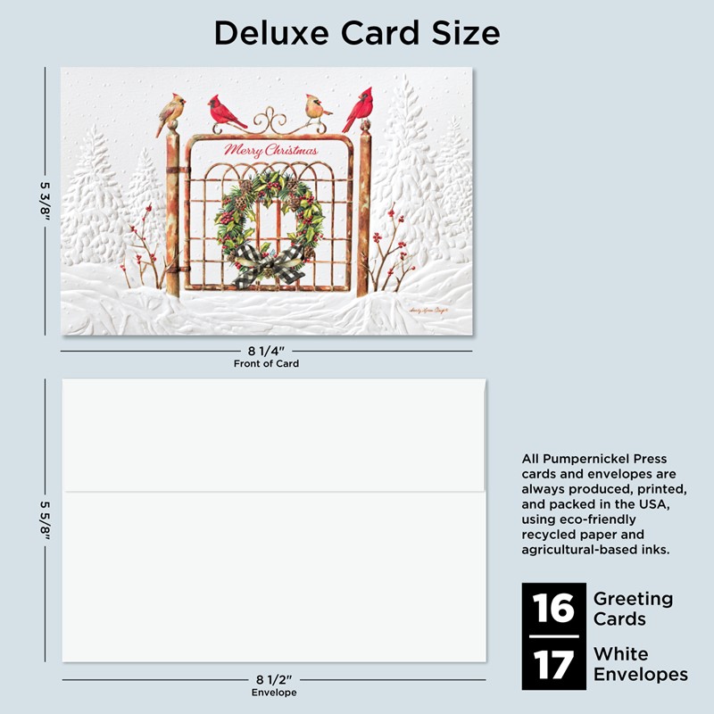 Our Deluxe Cards measure a generous 8-1/4"x 5-3/8", but require no additional postage to send. Cards are printed on uncoated, textured cardstock, using our signature production process for rich, brilliant colors. Our detailed, sculptured embossing gives our products a luxurious feel and quality, for a card to delight both giver and recipient. All Pumpernickel Press cards and envelopes are always produced, printed, and packed in the USA, using eco-friendly recycled paper and agricultural-based inks.