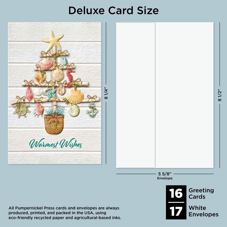 Our Deluxe Cards measure a generous 8-1/4"x 5-3/8", but require no additional postage to send. Cards are printed on uncoated, textured cardstock, using our signature production process for rich, brilliant colors. Our detailed, sculptured embossing gives our products a luxurious feel and quality, for a card to delight both giver and recipient. All Pumpernickel Press cards and envelopes are always produced, printed, and packed in the USA, using eco-friendly recycled paper and agricultural-based inks.