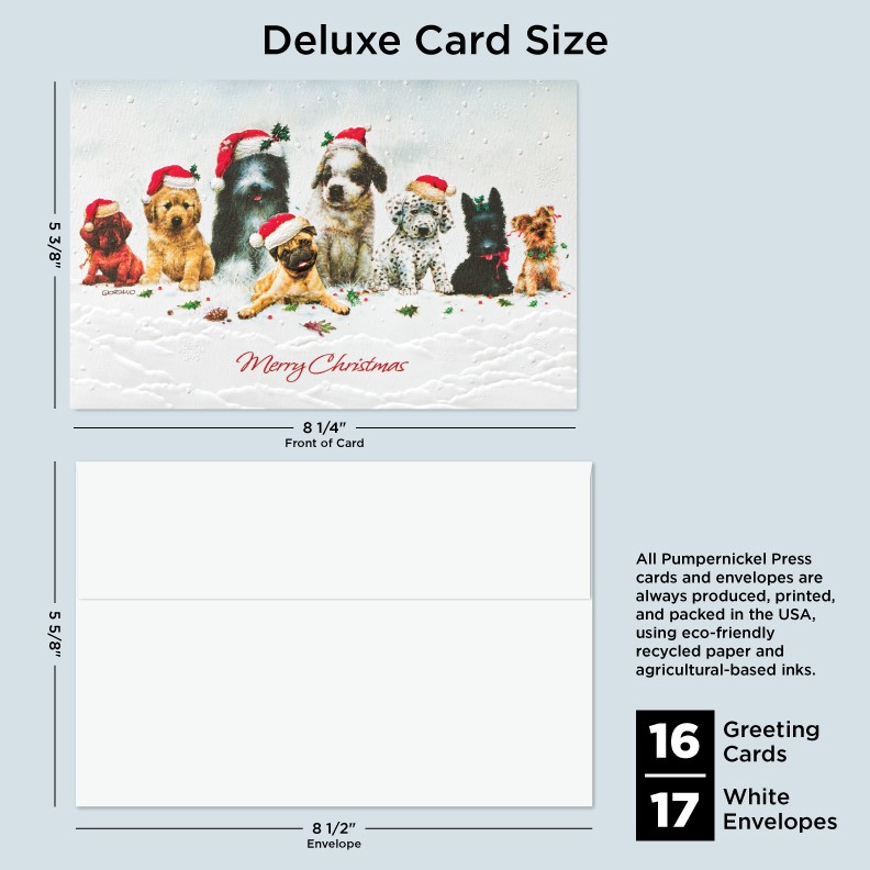 Our Deluxe Cards measure a generous 8-1/4"x 5-3/8", but require no additional postage to send. Cards are printed on uncoated, textured cardstock, using our signature production process for rich, brilliant colors. Our detailed, sculptured embossing gives our products a luxurious feel and quality, for a card to delight both giver and recipient. All Pumpernickel Press cards and envelopes are always produced, printed, and packed in the USA, using eco-friendly recycled paper and agricultural-based inks.