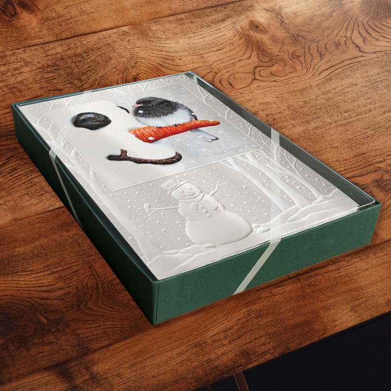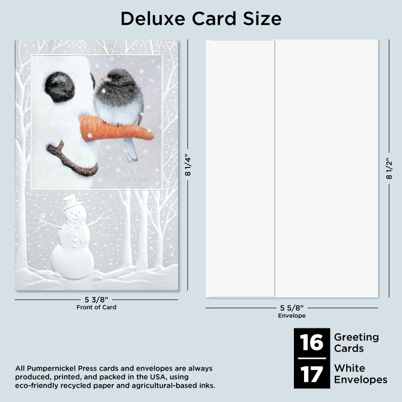 Our Deluxe Cards measure a generous 8-1/4"x 5-3/8", but require no additional postage to send. Cards are printed on uncoated, textured cardstock, using our signature production process for rich, brilliant colors. Our detailed, sculptured embossing gives our products a luxurious feel and quality, for a card to delight both giver and recipient. All Pumpernickel Press cards and envelopes are always produced, printed, and packed in the USA, using eco-friendly recycled paper and agricultural-based inks.